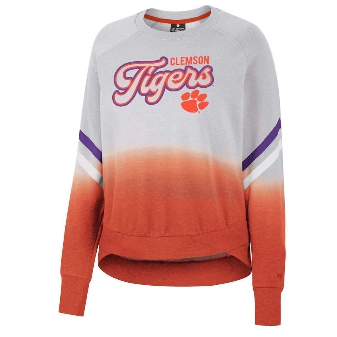 - Upgrade your rotation of official Clemson Tigers apparel with this Cue Cards pullover sweatshirt from Colosseum. It features a vibrant dip-dye design and contrast-color stripes on the sleeves, making it a unique option for game day. The raglan sleeves offer increased movement and comfortability for your arms and shoulders, which will come in handy when you are cheering the Clemson Tigers on to victory.