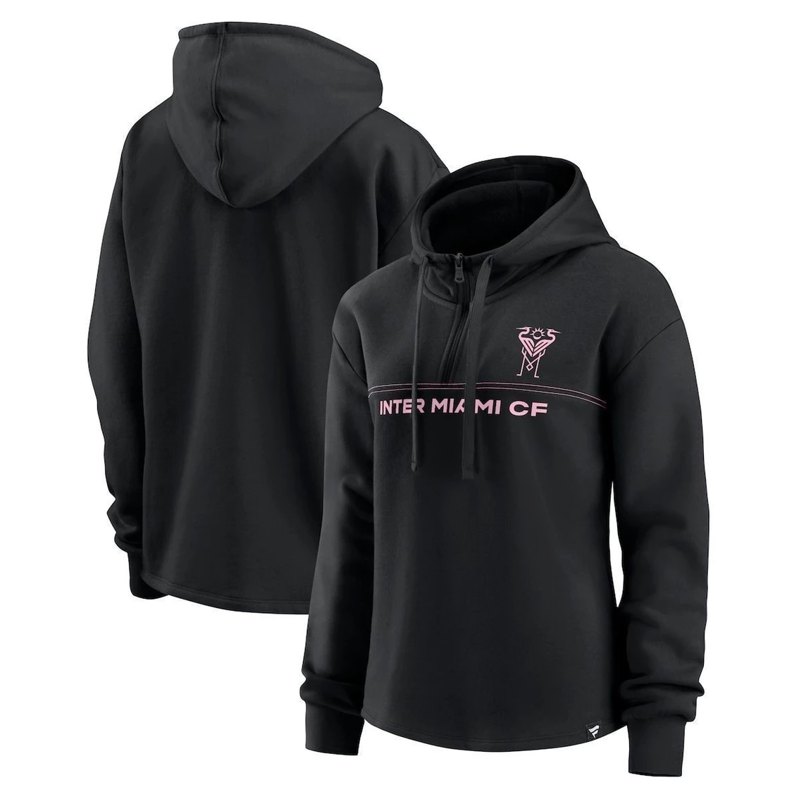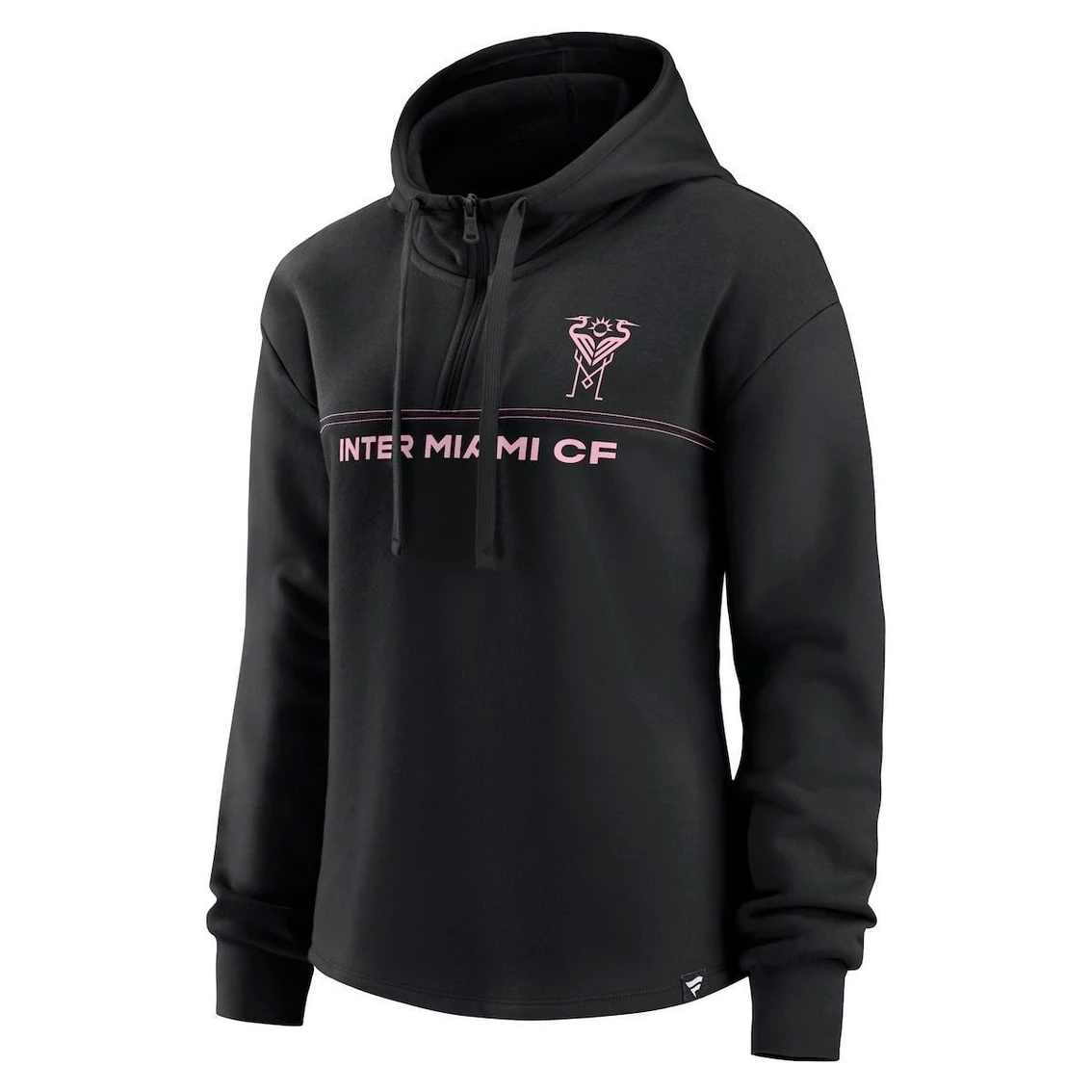 - Layer up with a spirited look by adding this Fanatics Branded Inter Miami CF quarter-zip hoodie to your wardrobe. A signature Inter Miami CF crest rests on the left chest, and the contrast-color panel gives it subtle flair. Plus, the rounded hem contributes to its comfortable fit and feel.