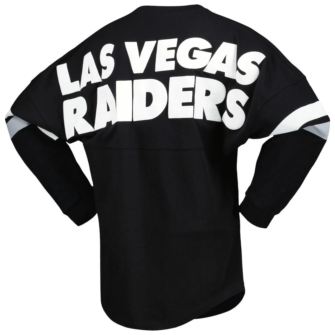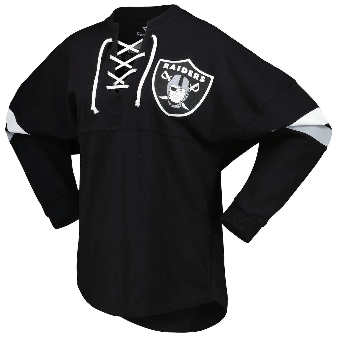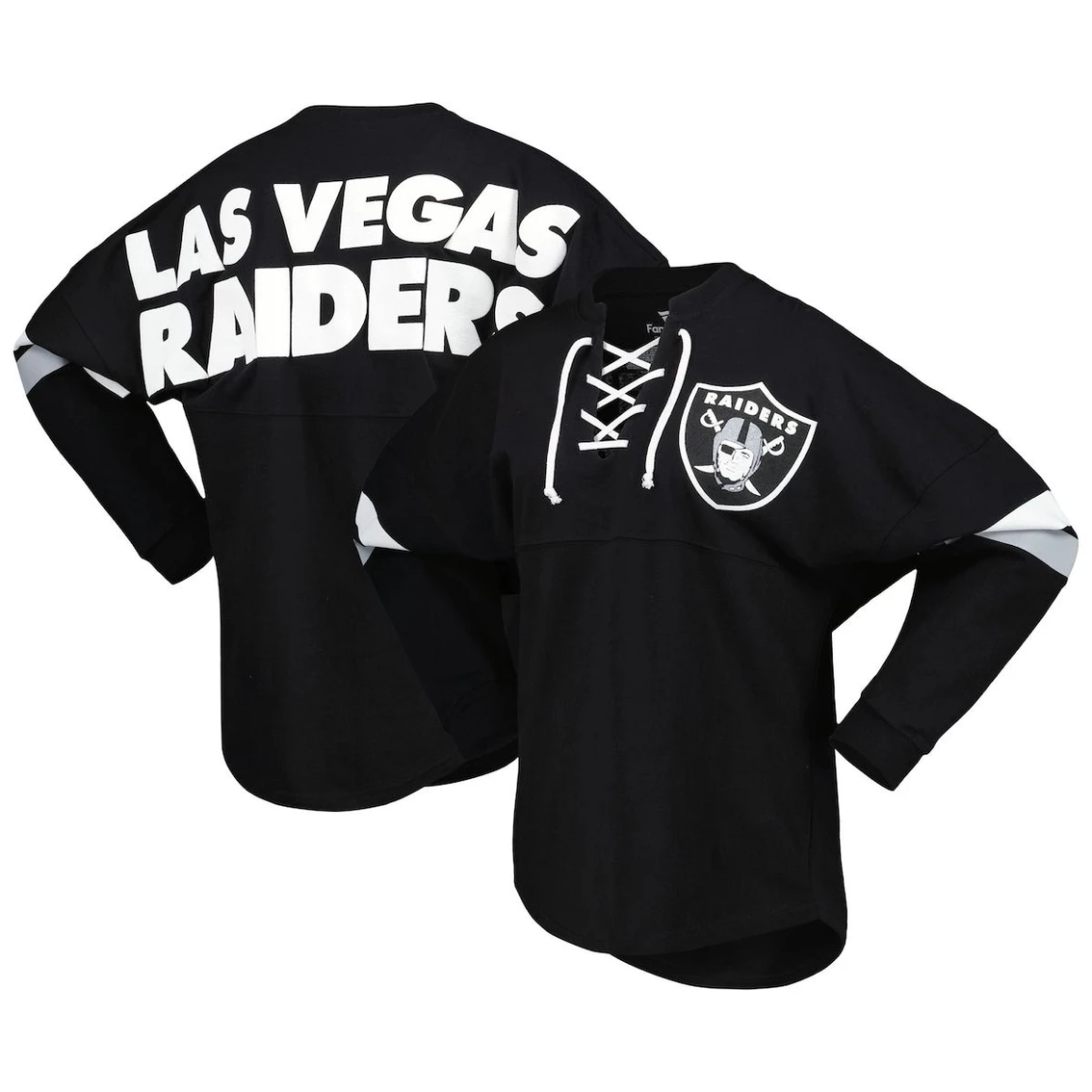 - Make a fashion statement on Las Vegas Raiders game day in this Spirit Jersey V-neck T-shirt from Fanatics Branded. It features a sporty lace-up neckline and stripes in team colors that highlight the Las Vegas Raiders graphics printed on the front and back. The longer, rounded hem also provides a more comfortable fit and feel.
