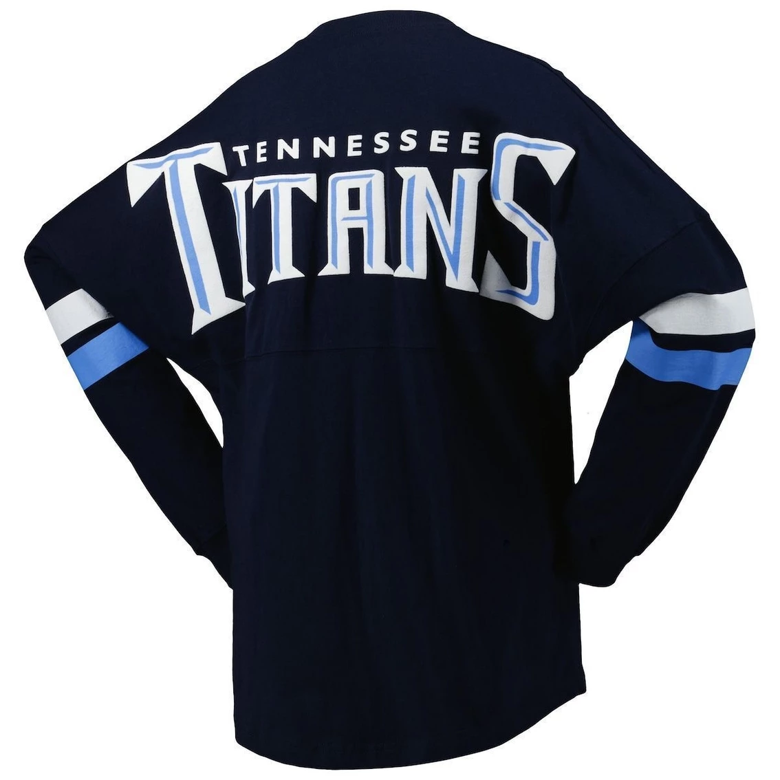 - Make a fashion statement on Tennessee Titans game day in this Spirit Jersey V-neck T-shirt from Fanatics Branded. It features a sporty lace-up neckline and stripes in team colors that highlight the Tennessee Titans graphics printed on the front and back. The longer, rounded hem also provides a more comfortable fit and feel.