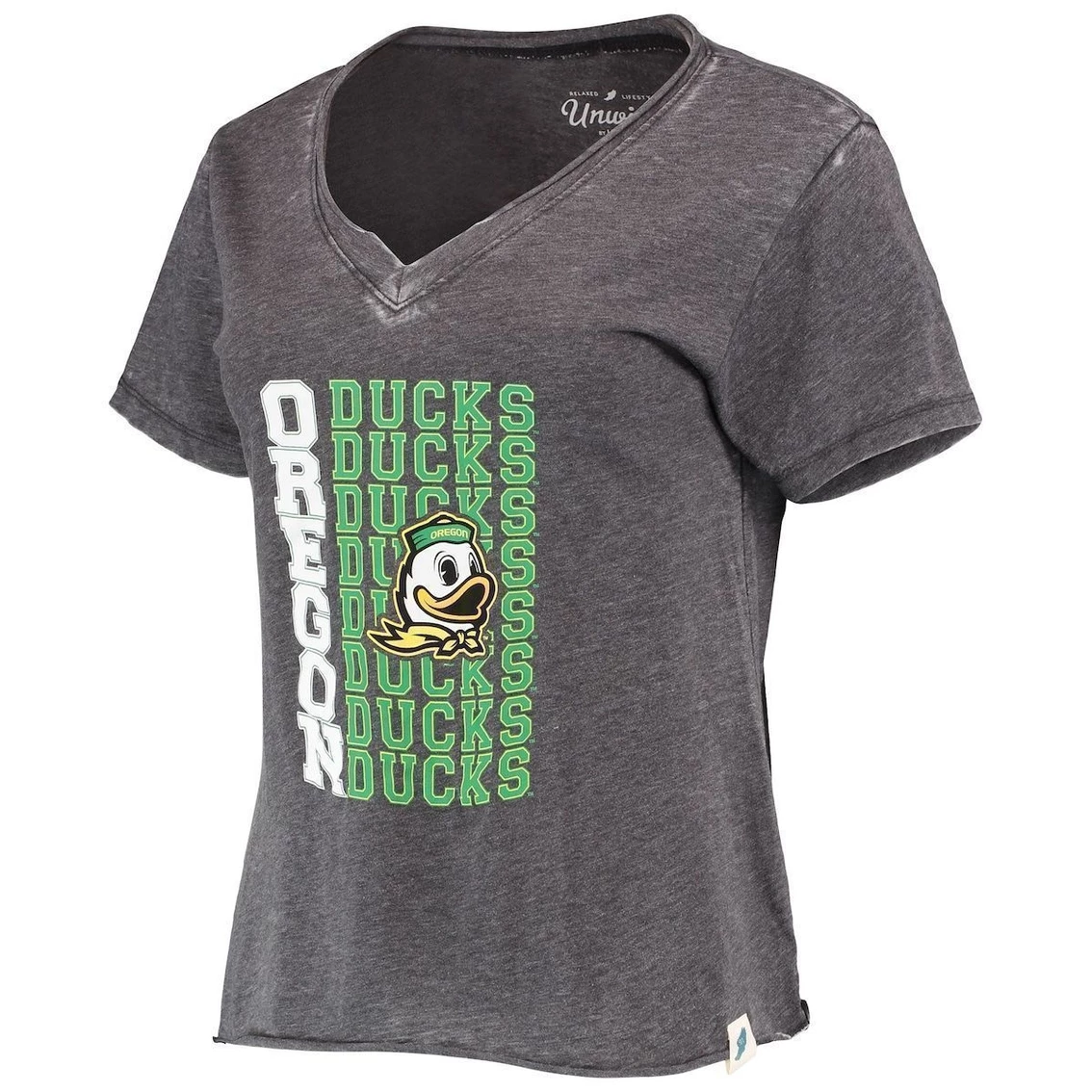 - Put a fun twist on laid-back style with this Oregon Ducks V-neck T-shirt from League Collegiate Wear. Its burnout fabric is specially dyed and treated to create a worn-in look and feel. A loose-fit body provides extra comfort, and raw edges add the finishing touch to the vintage design of this Oregon Ducks tee.