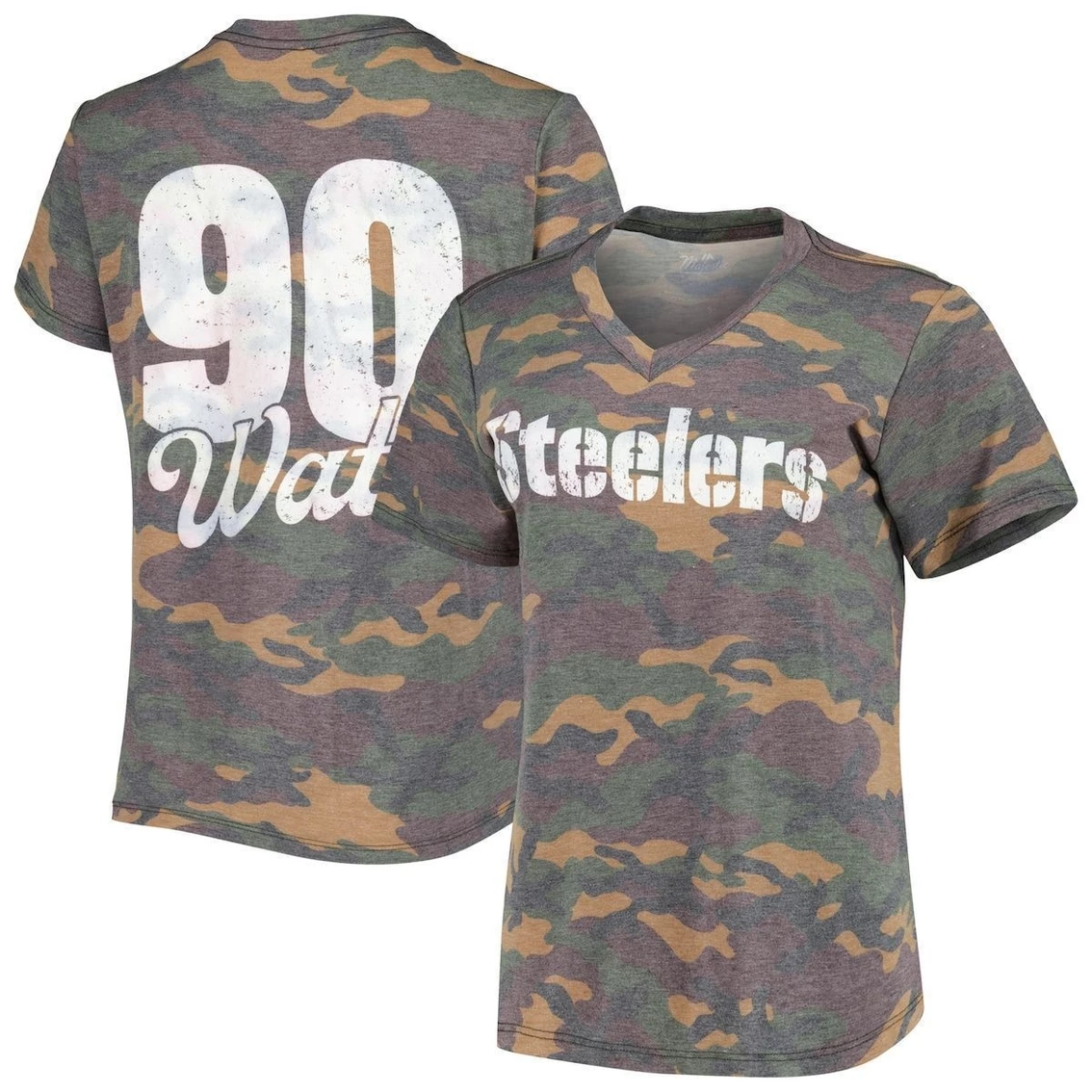 - Show off your Pittsburgh Steelers pride and your love for T.J. Watt by grabbing this Camo T-shirt. Along with a classic V-neck, this tee offers soft cotton to keep you comfortable no matter the outfit you put together. Plus, the striking Pittsburgh Steelers graphics on the chest and your favorite’s name and number on the back elevate your fandom from all directions.