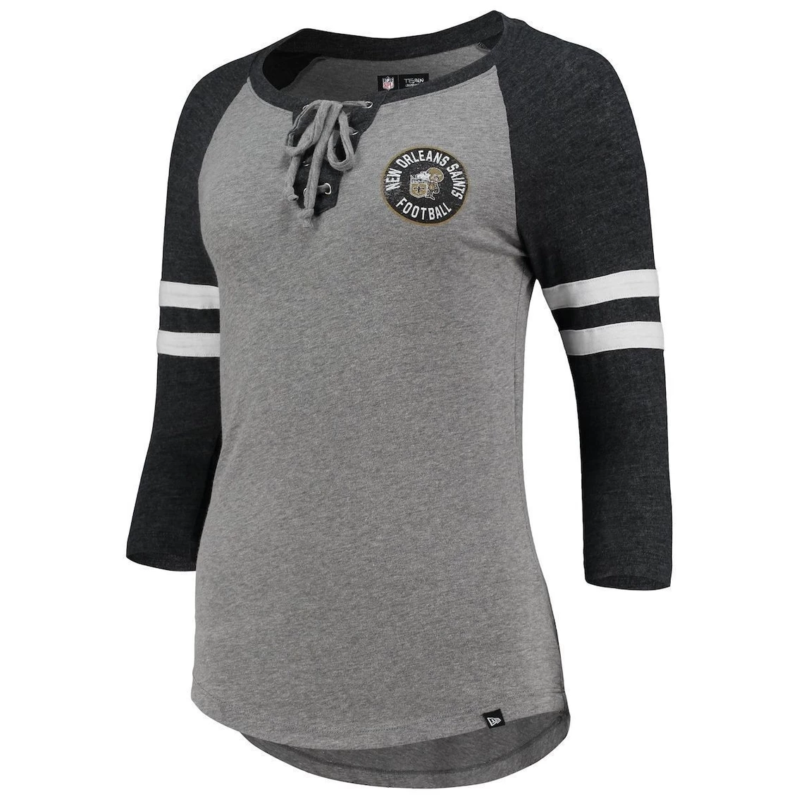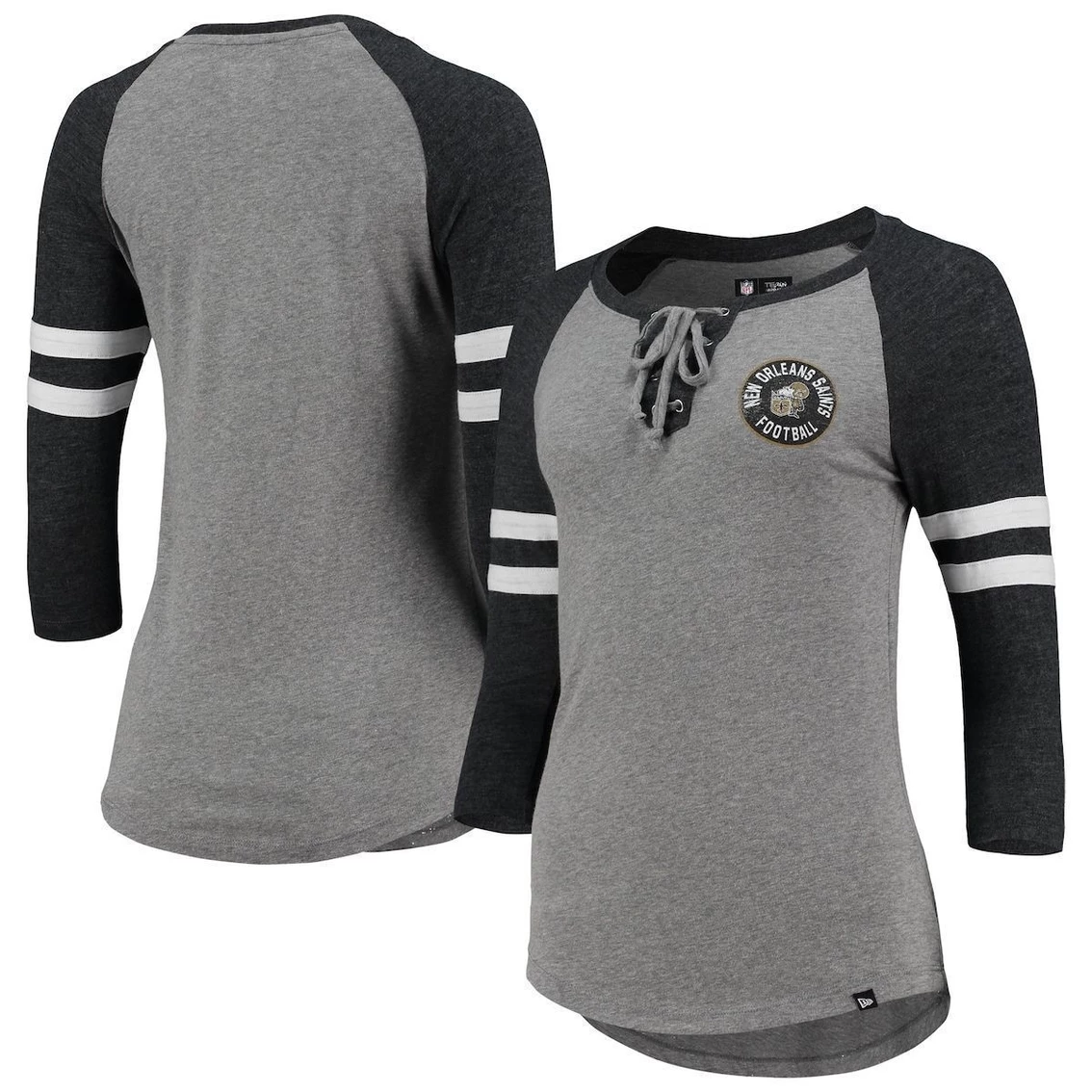Promo 🤩 Women's New Era Heathered Gray New Orleans Saints Throwback Raglan 3/4-Sleeve Lace-Up T-Shirt ⭐
