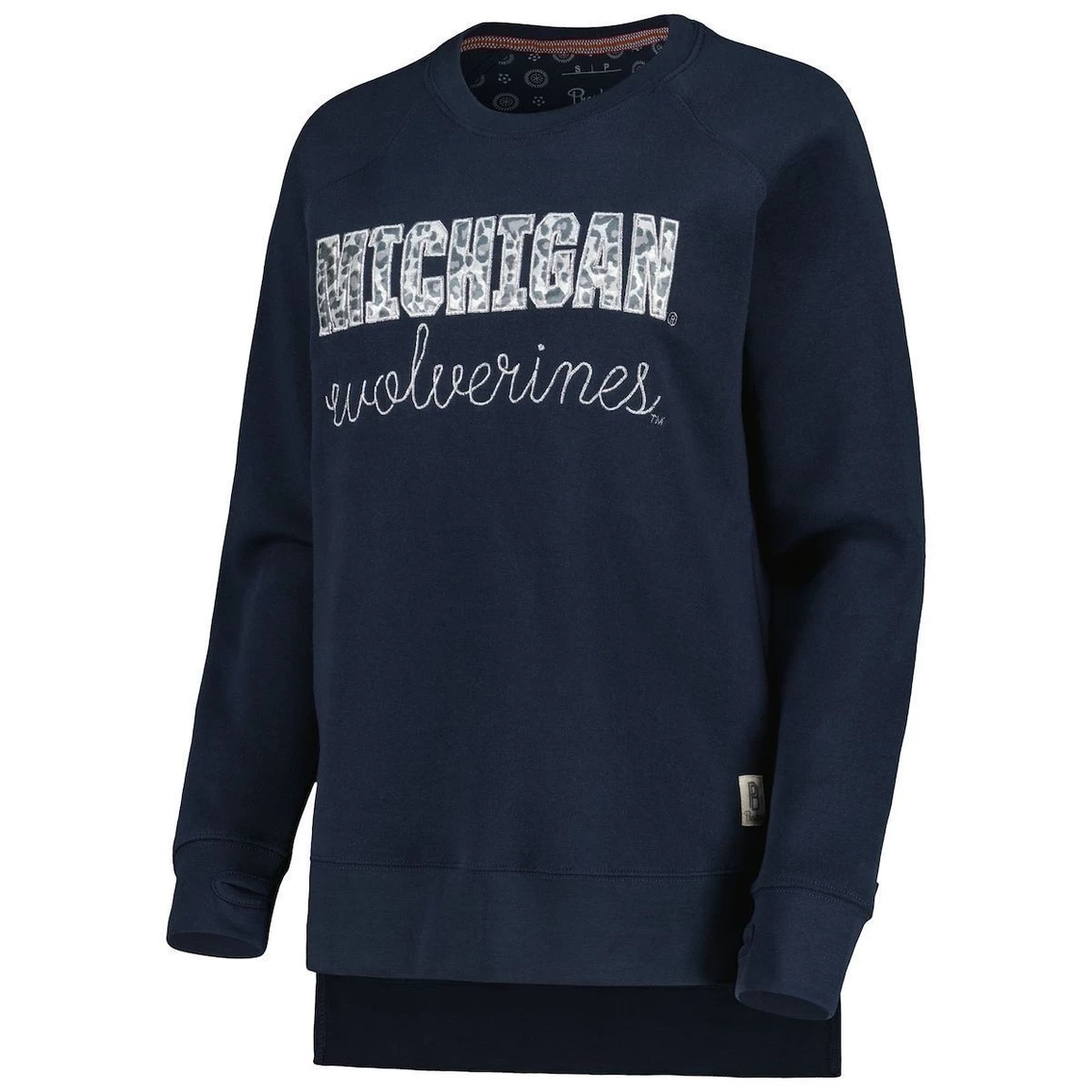 Wholesale π€© Women's Pressbox Navy Michigan Wolverines Steamboat Animal Print Raglan Pullover Sweatshirt π₯