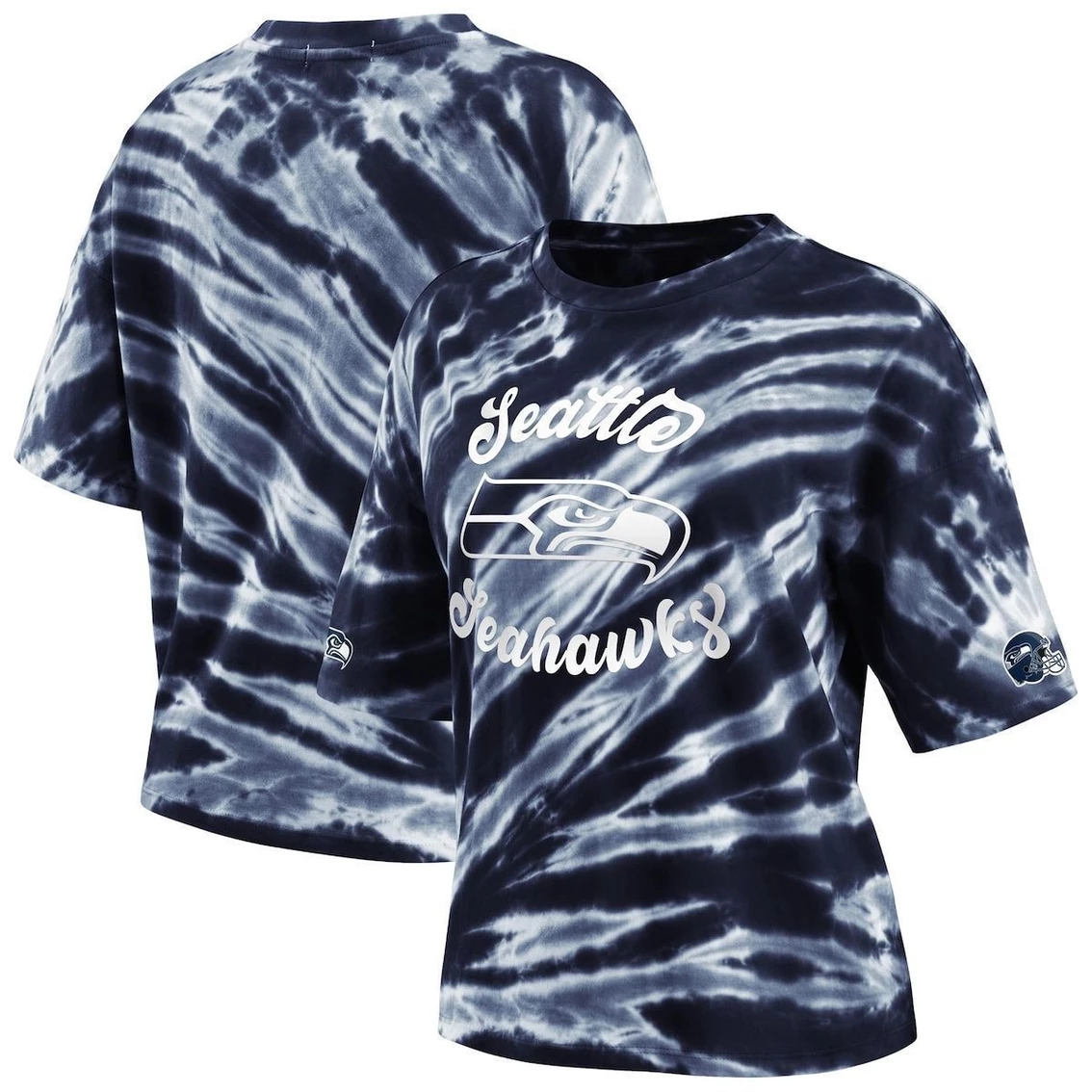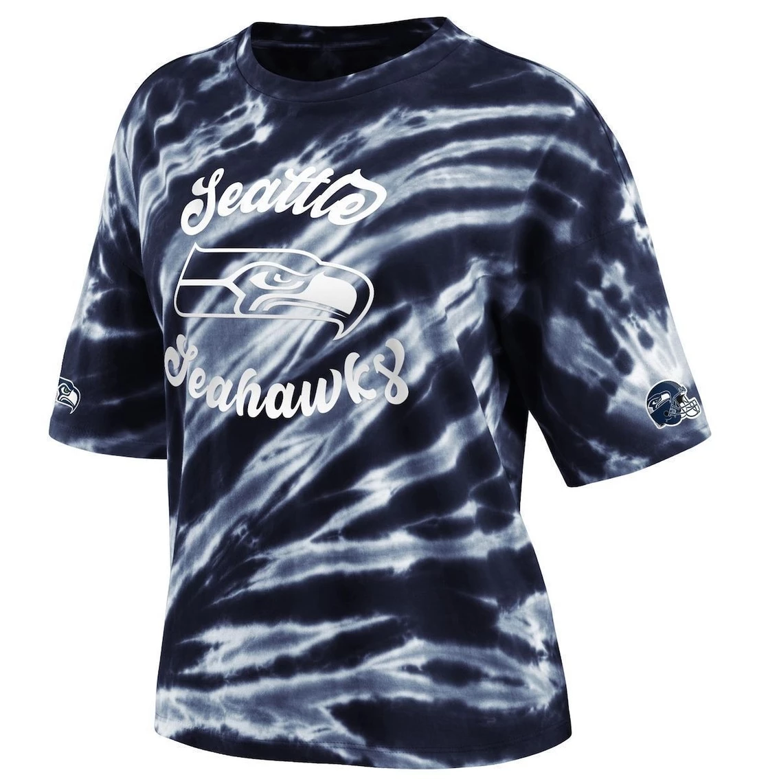 - Go bold on style with this Seattle Seahawks T-shirt from WEAR by Erin Andrews. It features printed Seattle Seahawks graphics accentuated by the striking tie-dye pattern in a vibrant team color. The cotton fabric also gives this attention-grabbing tee a comfortable feel.